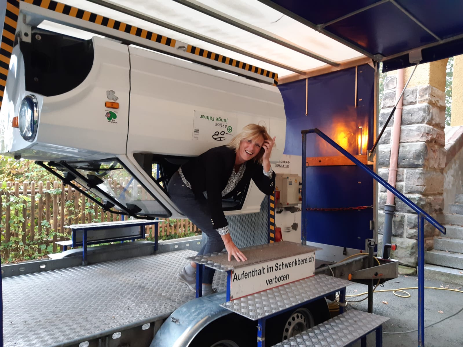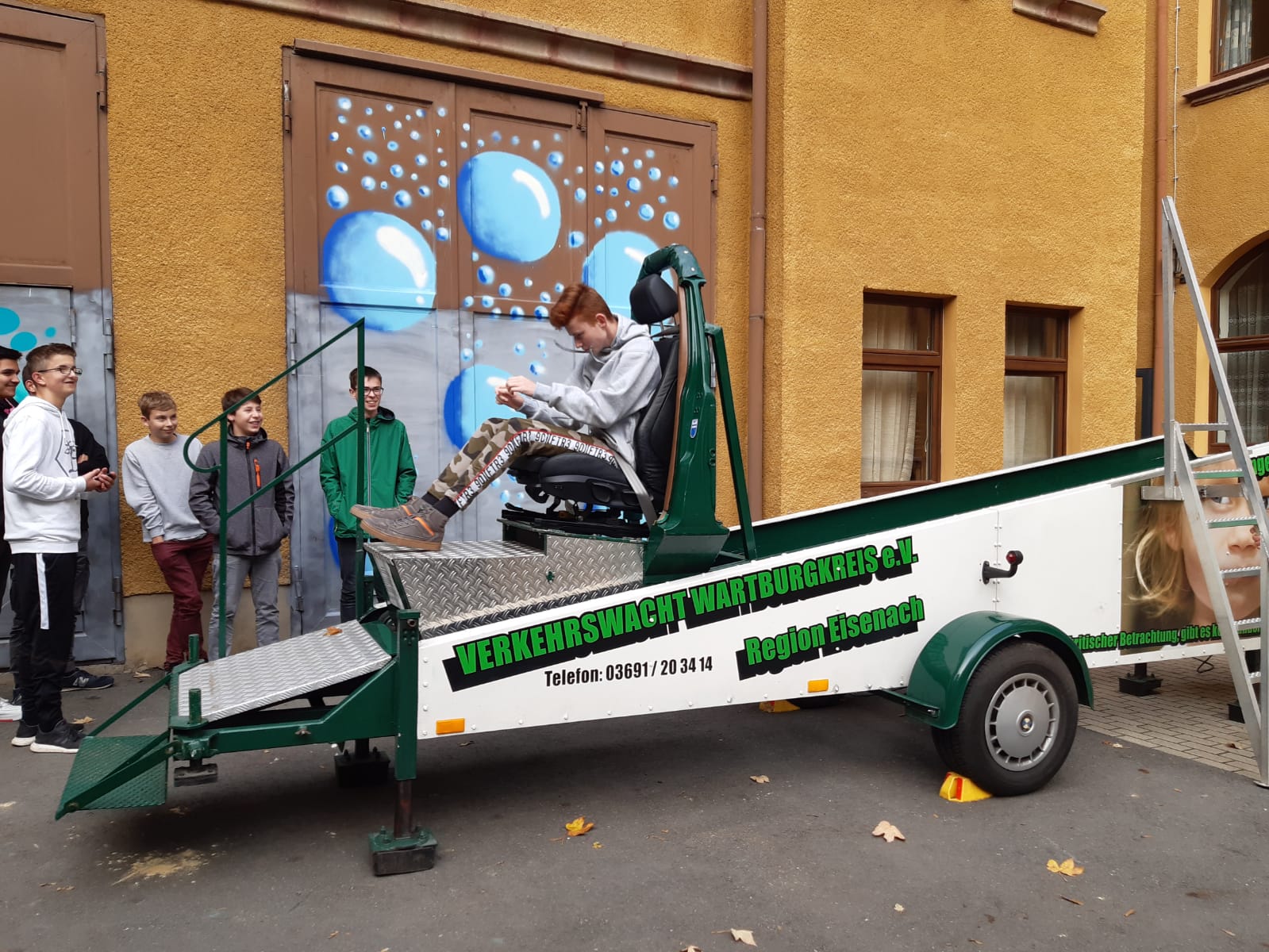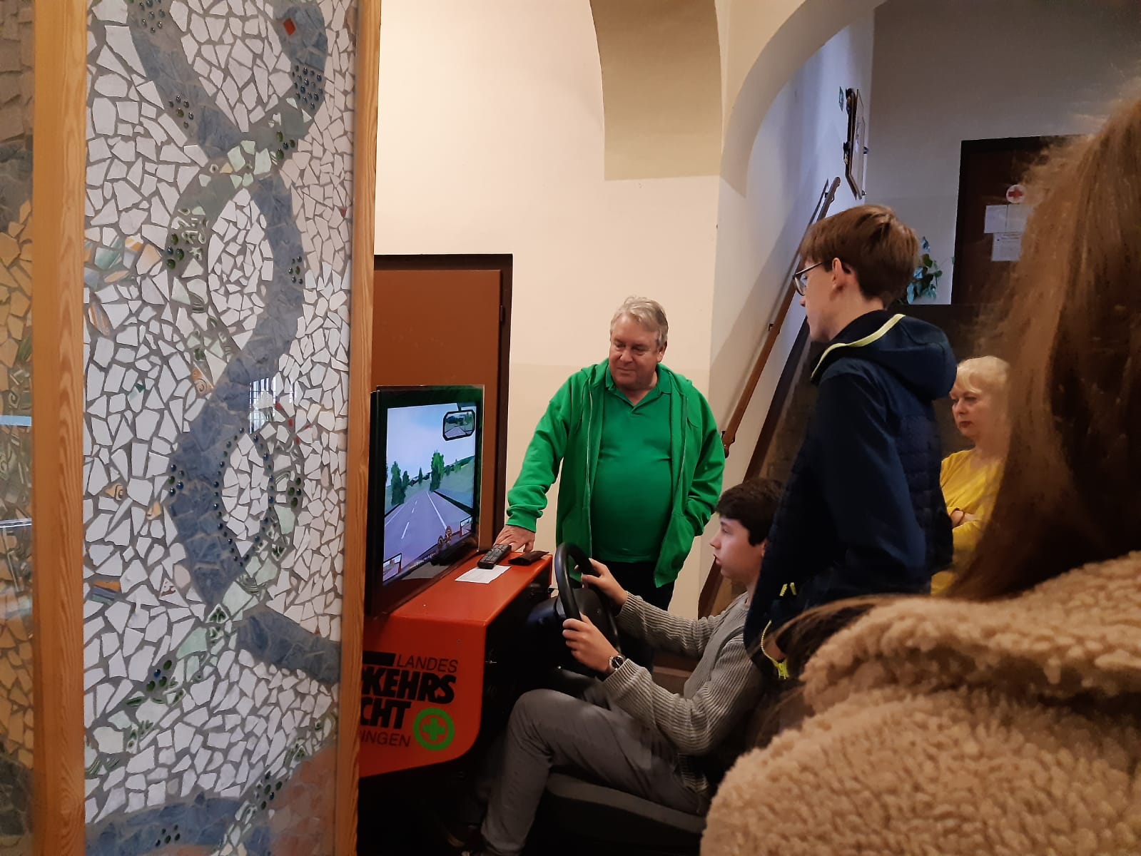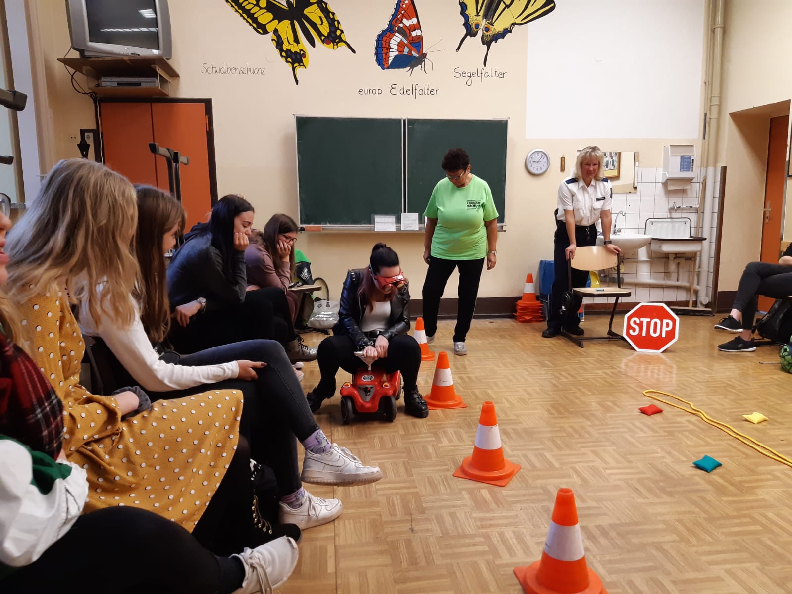 Mit dem Moped zur Schule - eine Gefahr für sich selbst und andere? Diesen Eindruck konnte man im letzten Schuljahr einige Male gewinnen. Deshalb setzte sich der Förderverein unserer Schule dafür ein, dass die SchülerInnnen der Klassen 9 bis 12 an einem Verkehrssicherheitstraining teilnehmen konnten. Am 22.10. bekamen wir an den Stationen Rauschbrille, Verkehrsquiz, Fahrphysik, Überschlagssimulator, Bremssimulator, PKW - und Mopedsimulator und Gurtschlitten einen lebhaften Eindruck in verschiedene Gefahrensituationen. Wir konnten lernen, wie man solche Situationen vermeidet oder besser mit ihnen umgeht. Zum Abschluss gab es noch einige Preise für die Gewinnerinnen des Verkehrsquiz. Vielen Dank an den Förderverein für die Organisation dieses Tages.